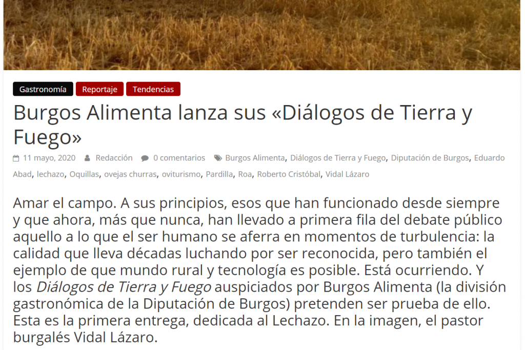 Los diarios Origen y El Periódico Digital, dedican una noticia a Burgos Alimenta y su primera edición de los «Diálogos de Tierra y Fuego», cuyo protagonista en esta ocasión, es el Lechazo. Para ello, cuentan con la participación de Eduardo Abad, Vidal Lázaro y Roberto Cristóbal, 3 perfiles que continúan el legado de sus familias, al tiempo que han sabido adaptarse a las nuevas necesidades que han ido surgiendo.