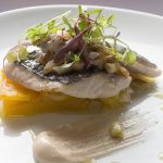 Corvina con calabaza y salsa de alcachofas y foie